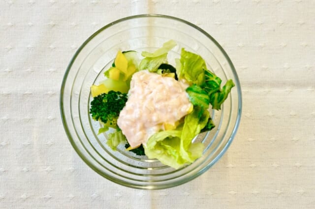 - 器にレタスを敷き、ブロッコリー、きゅうり、黄パプリカの順で彩りよく盛り、