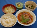・秋の味覚 秋刀魚の蒲焼ご飯 ・煮やっこの野菜あん ・ブロッコリーの甘酢和え ・きのこたっぷりスープ ・お茶ゼリーの豆乳デザート