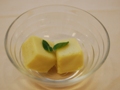 冷たい牛乳寒天の上に、冷たいいとこ煮のソースをかけたデザートです。いとこ煮という名は、堅いものからおいおい・めいめい煮たことに由来しているという説と、同じ畑で収穫された野菜だから、いとこ煮という説もあります。