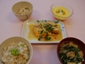・枝豆ごはん ・豆腐ときのこの味噌バター煮込み ・こまツナサラダ ・すまし汁(根菜入り) ・フルーツレアチーズ風
