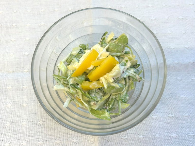 彩り豊かなさっぱりとした味わいのサラダです。たまねぎやピーマンは水にさらしておくことで生でもおいしく食べられます。