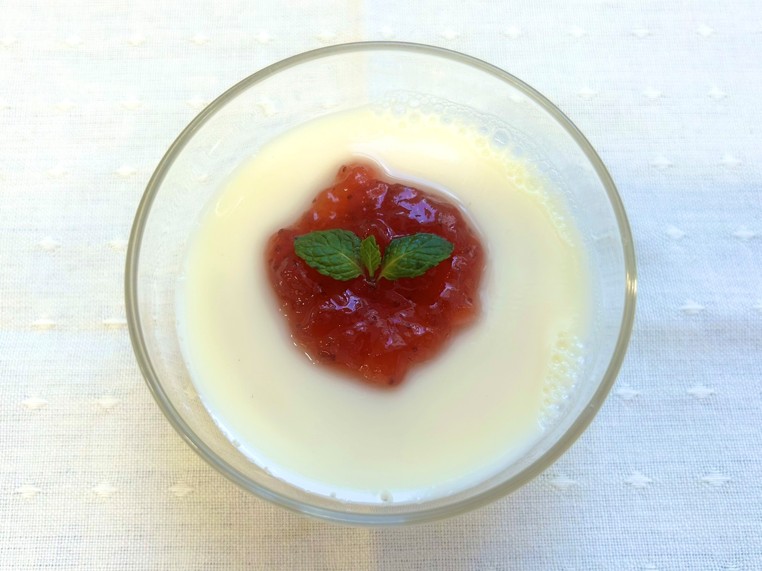 豆乳を使ったプリンです。いちごジャムとミントの葉のトッピングがクリスマスらしい彩りを演出しています。