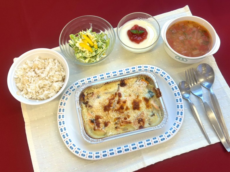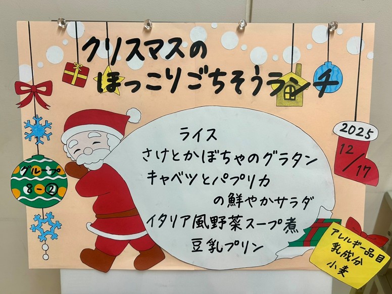クリスマスカラーを意識した献立です。野菜をたくさん摂れるように工夫しました。