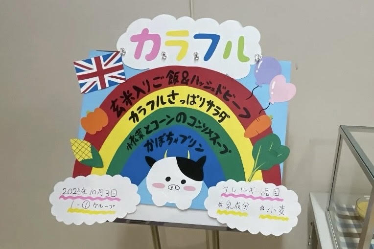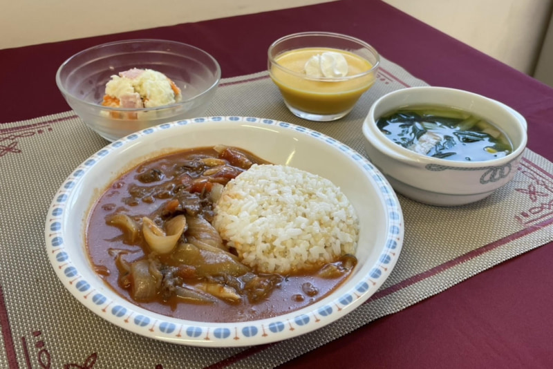 カラフルさっぱりサラダのきゅうりの緑、にんじんのオレンジ、ハムのピンクに加え、ハッシュドビーフの茶色やかぼちゃプリンの黄色によって、カラフルさを出した献立です。カラフルであると、見栄えが良くなるため食欲が増進したり、栄養素のバランスがとれたりなど心身に良い影響をもたらすことができます。