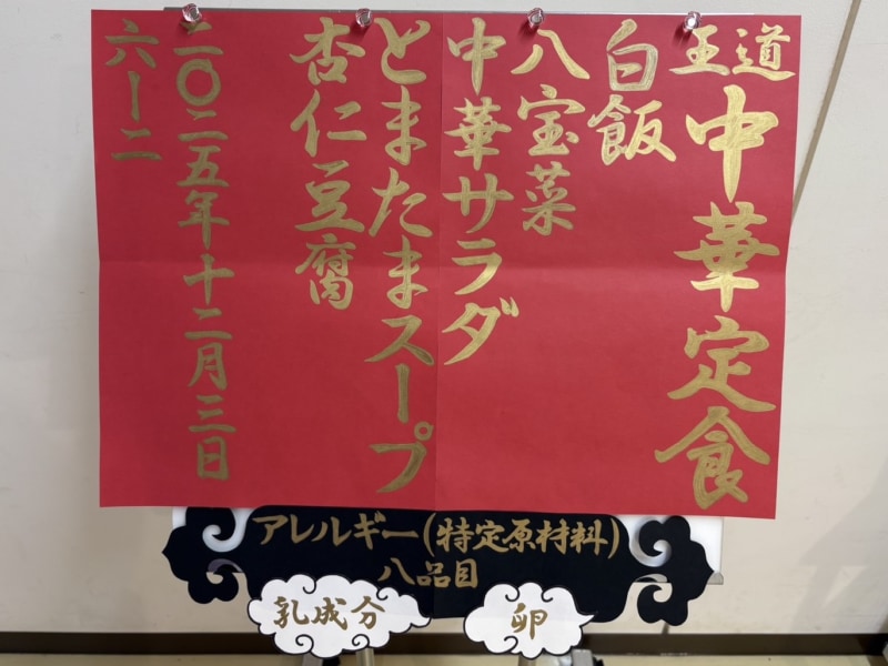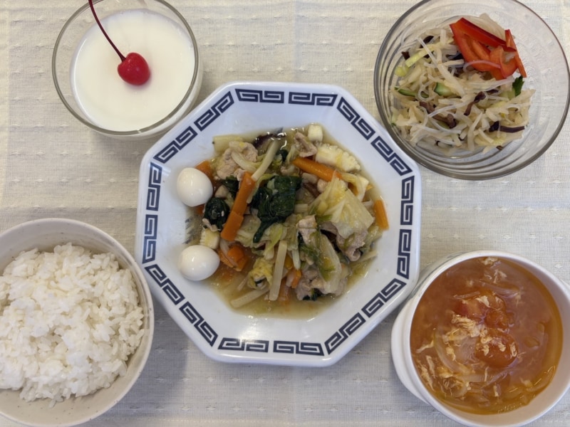 "とろっとした八宝菜、シャキシャキとしたサラダ,ぷるぷるのデザートでたくさんの食感が楽しめます。 主菜の緑に、スープやサラダの赤色がアクセントになり、彩の良い献立です。"