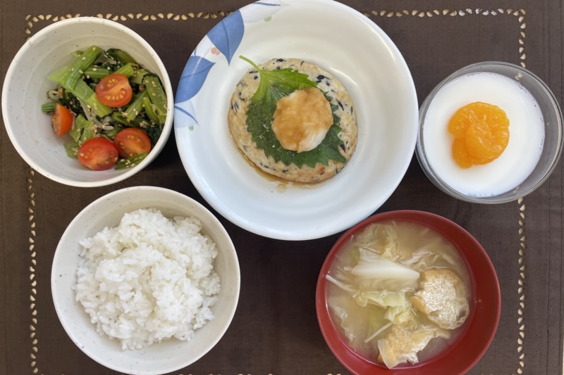 ふわふわとした食感が特徴の豆腐ハンバーグをメインに、ご飯、和え物、みそ汁、デザートを組み合わせた身体にやさしい満足定食です。
