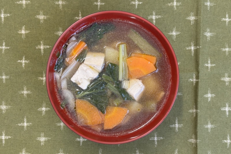 野菜類を多く使い、食べ応えのあるヘルシーなけんちん汁です。食物繊維を摂取できるように工夫しました。