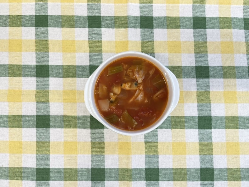 野菜にあさりを入れたミネストローネです。トマトの酸味とあさりのうま味を感じるあったかいスープです。