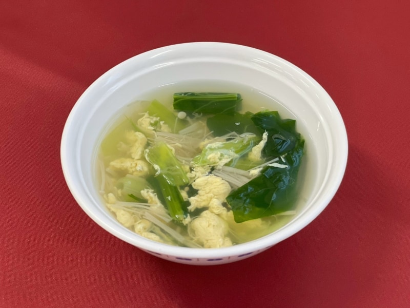 素材の味を楽しめる、やさしい口当たりのスープです。卵や小松菜の彩が、食欲をそそります。
