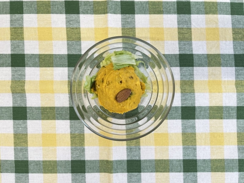 クリームチーズ、マヨネーズ、ヨーグルトの酸味と、かぼちゃの甘みがマッチし、アーモンドのザクザク感が感じられるサラダです。