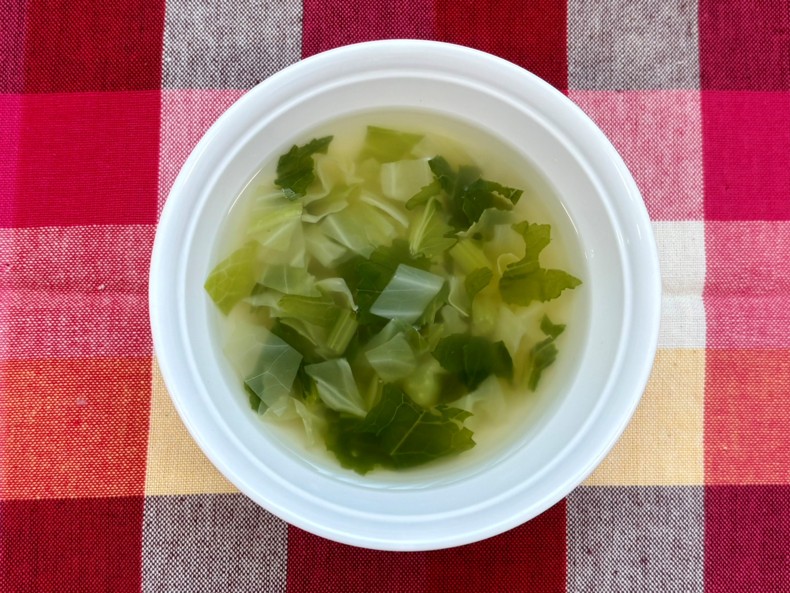 キャベツと大根の葉がたくさん入った具沢山の優しい味のスープです。